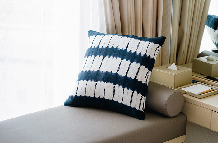 Guestroom carpets and textiles feature auspicious patterns, with sofa cushions in traditional Arimatsu-shibori fabric.